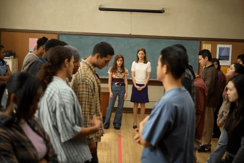 Mesela seminerlerde yine en çok bahsedilen filmlerden diğeri de Freedom Writers. Bu filmde de birçok “potansiyel suçluyu” içinde barındıran tehlikeli bir okula yeni öğretmen olarak gelen Bayan Gruwell, Mahmut Hoca’yı oynuyor. Bir yanda hayatındaki (evlilik konuları) problemlerle boğuşurken sonunda içerisinden geçtiği zor süreçte öğrencilerine kendini vererek psikolojik olarak iyileşiyor. Normalde yapmayacağı şeyler yaparak öğrencilere “dokunuyor”.